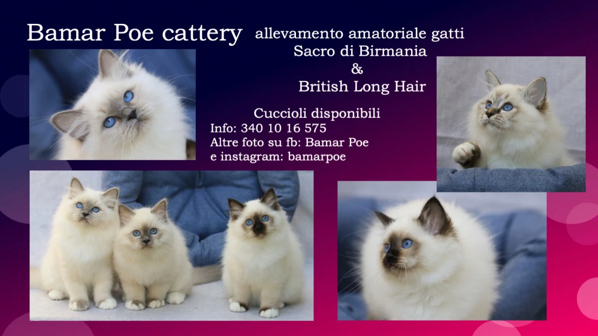 Bamar Poe cattery, allevamento amatoriale di gatti Sacro di Birmania e British Long Hair. Disponibili cuccioli di Sacro di Birmania. Venite a trovarci. Ci troviamo a Nerola, a circa una quarantina di chilometri da Roma, sulla Salaria.